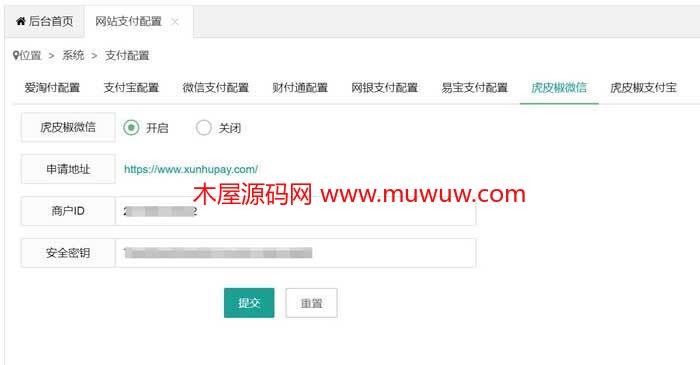 3、在后台支付设置里面填入虎皮椒微信和支付宝的appid 、秘钥;