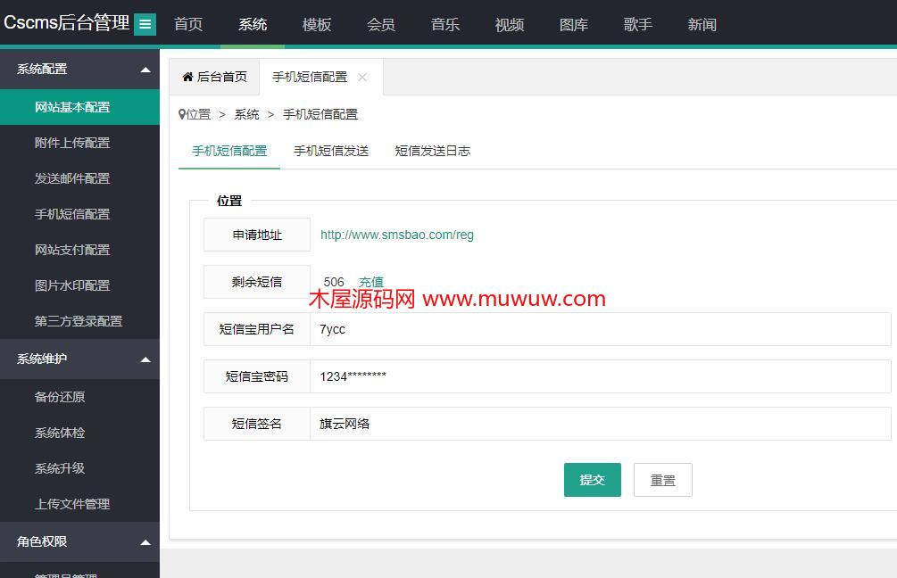 2、在后台-系统配置-手机短信配置 设置好短信宝的账号密码,成功后后台会显示还剩多少条短信;