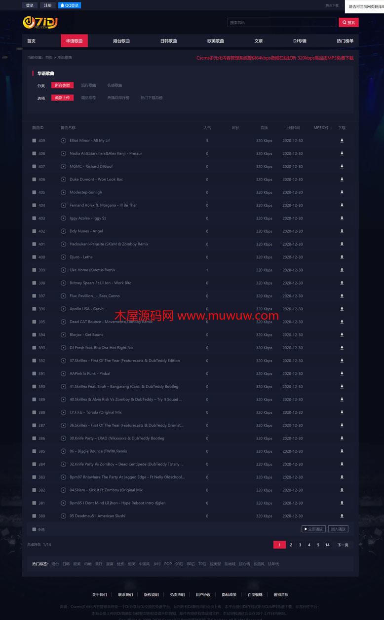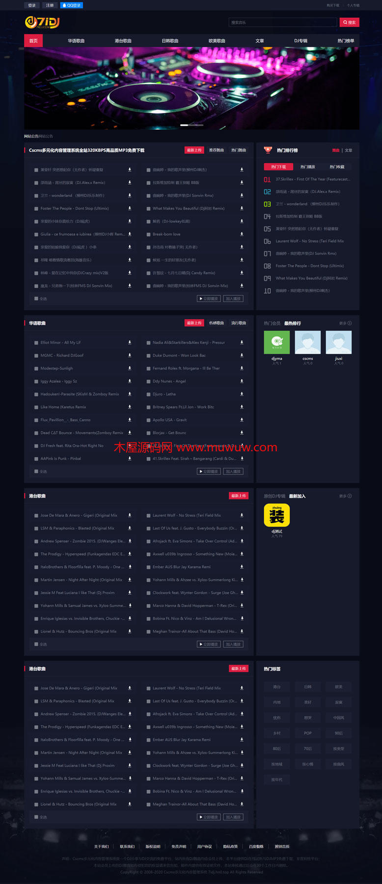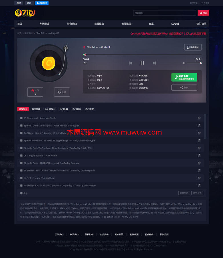 cscms 4.1版本 7idj风格模板,后面才发现其实也就是dj95的新版模板,utf8编码,整站程序,数据库不带演示数据,喜欢的朋友可以购买使用,购买后如有问题联系993446047处理;