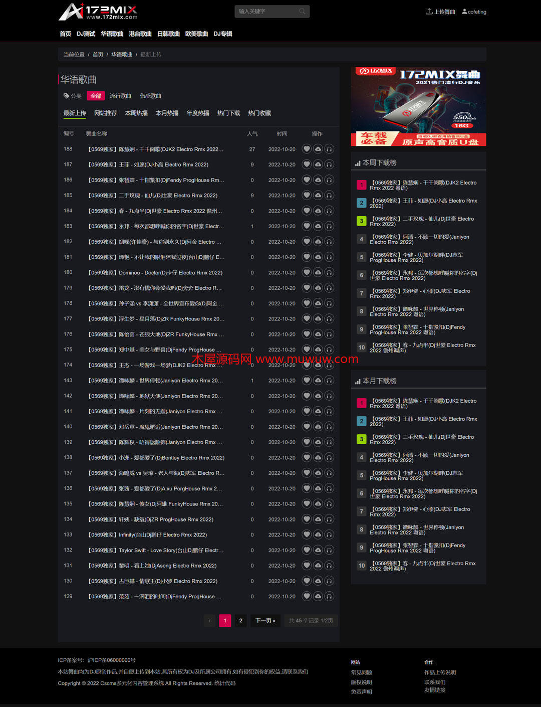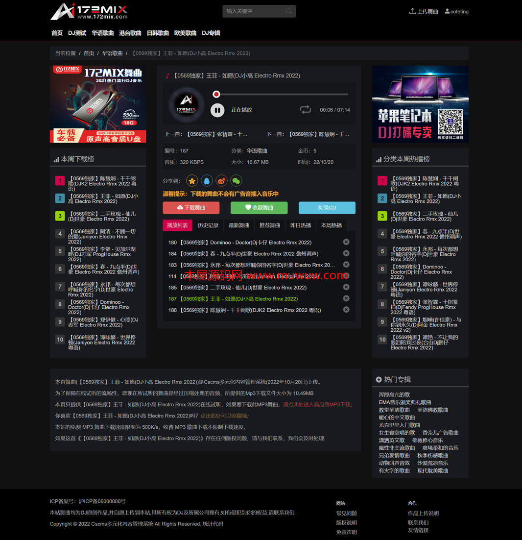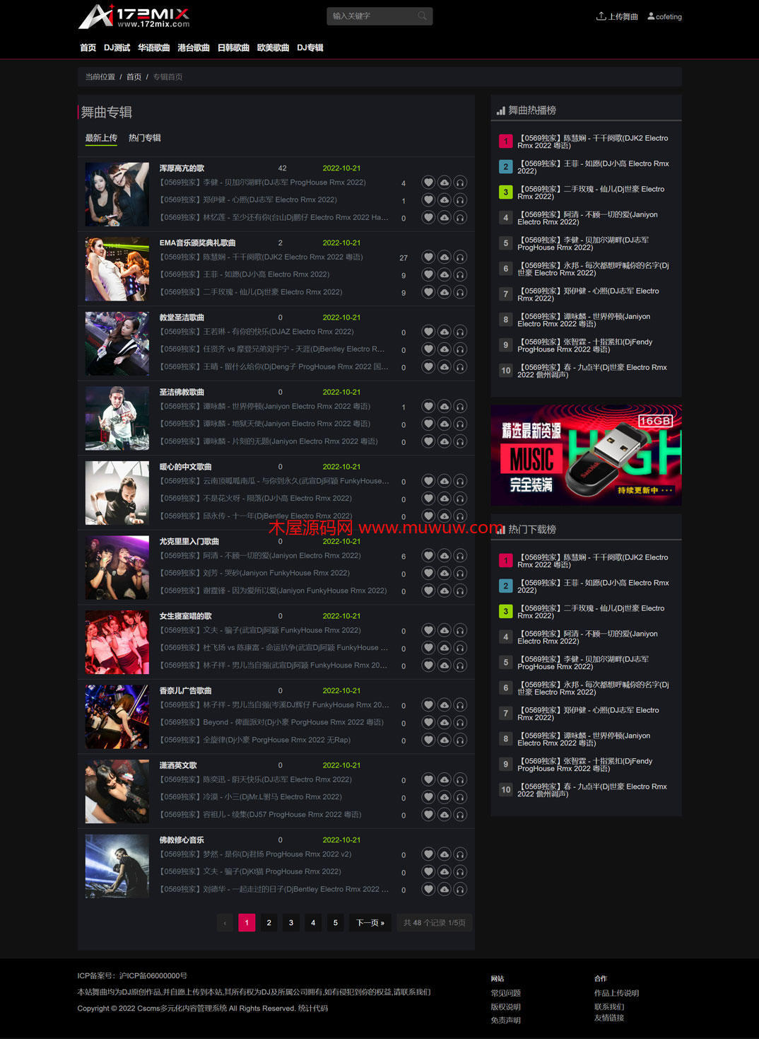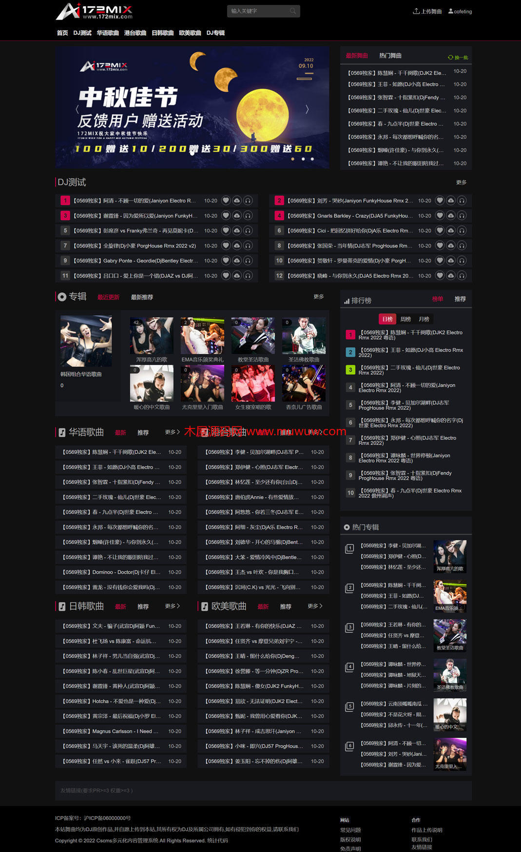 模板风格来自172mix舞曲网,页面和功能基本都一比一,分页模板不带月份分类(可二开),带帮助页面,非常大气的一套黑色dj网站模板,适合做舞曲、电音等站点,由于172mix的会员中心和清风dj的会员中心基本一样,所以会员中心直接使用的清风dj的模板,不带手机模板,看中的可以看看。