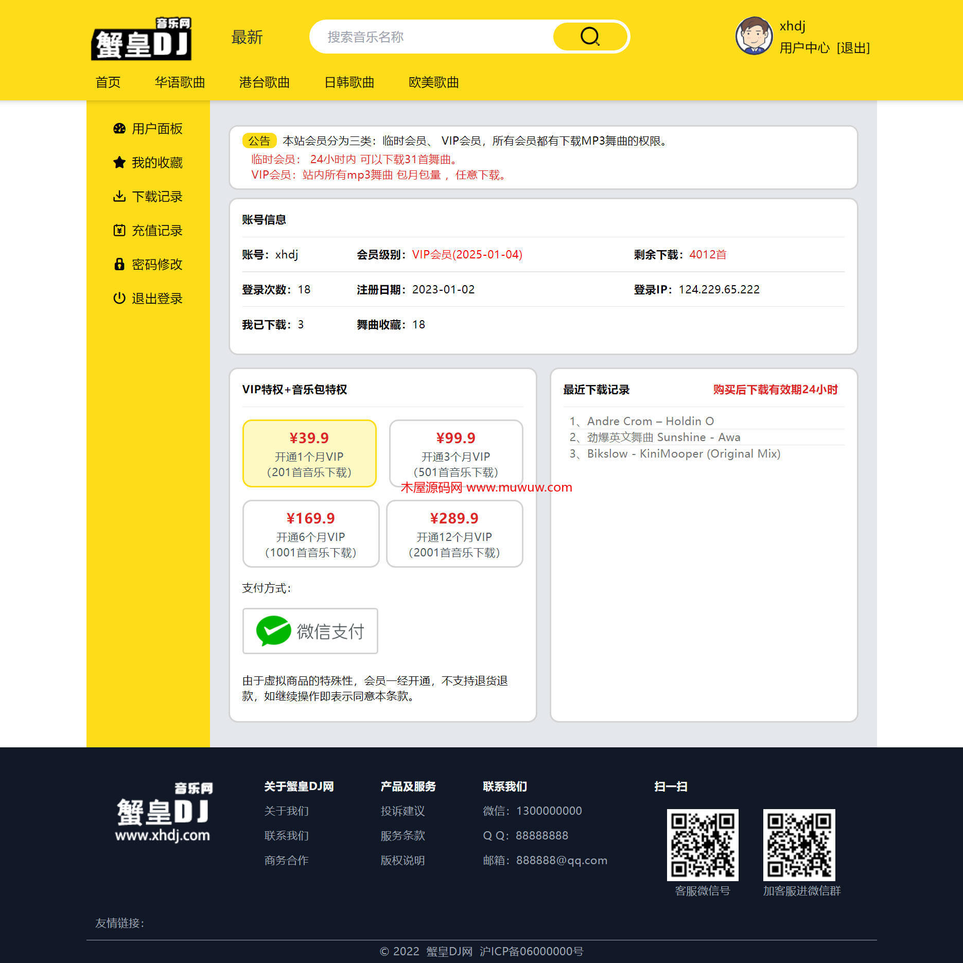 会员vip部分再原始的cscms上面做过改变,取消了金币下载,改成了套餐包月包量下载,支持临时一天会员、VIP包月包年会员,支付渠道仅支持微信支付官方渠道,需要其它三方渠道可以联系二开(费用另算);