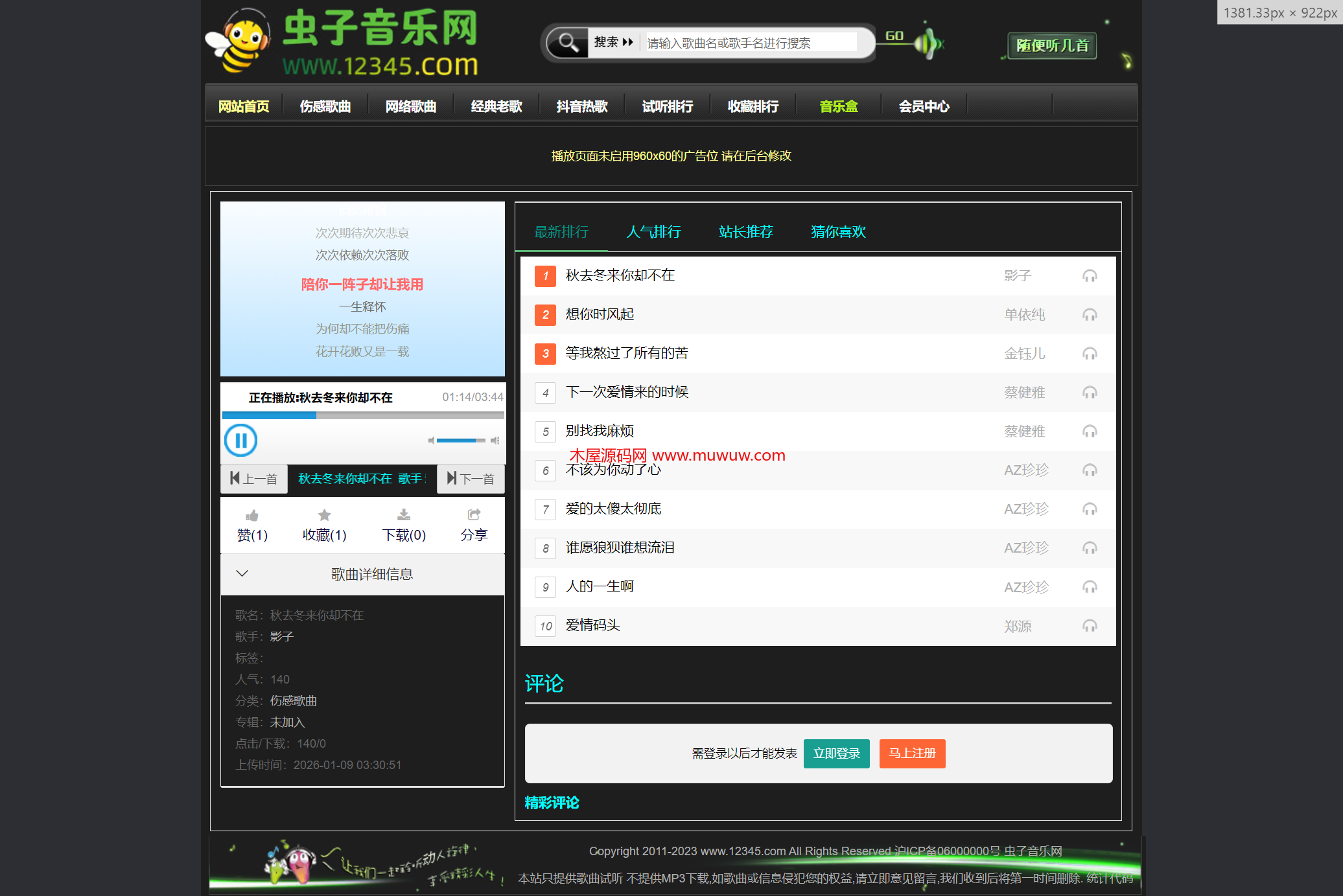 这款基于Cscms 4.2开发的虫子音乐网模板,主打黑色系 DJ 舞曲风格,酷炫沉稳的视觉设计完美契合舞曲类音乐网站的潮流调性。模板功能架构清晰完备,涵盖歌曲、文章、歌手、会员中心四大核心模块:歌曲模块支持便捷检索与播放,文章模块可发布舞曲资讯,歌手模块能集中展示代表作,会员中心则为用户提供个性化收藏、信息管理等服务。经典的布局设计适配 Cscms 4.2 系统特性,运行稳定流畅,是搭建专业 DJ 舞曲音乐网站的优质选择。